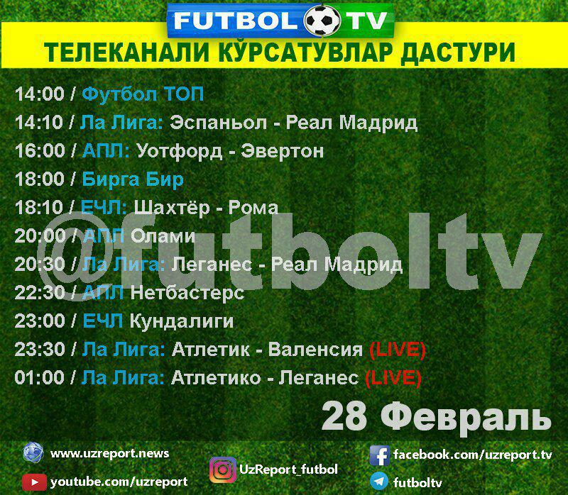 FUTBOL TVнинг бугун, 28 февраль кунги кўрсатувлари дастури билан танишинг.