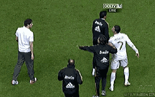 Ўйин пайтида майдондан қизил карточка олиб четлатилган Хави Мартинес Криштиану Роналдунинг ёнидан ўтиб кетаётганида уни симулянт деб атаган. Португалиялик юлдуз эса "Биз испания чемпионимиз" дея қўлини юқорига кўтарганича Мартинесга жавоб қайтаради.