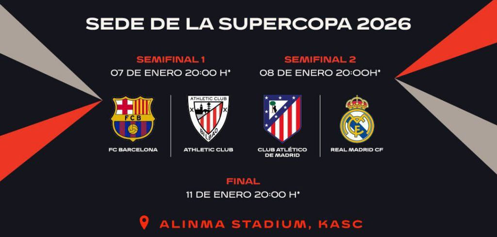Испания қироллик футбол федерацияси 2026 йил январь ойида бўлиб ўтадиган мамлакат Суперкубоги ўйинларининг саналари ва бошланиш вақтларини тасдиқлади.