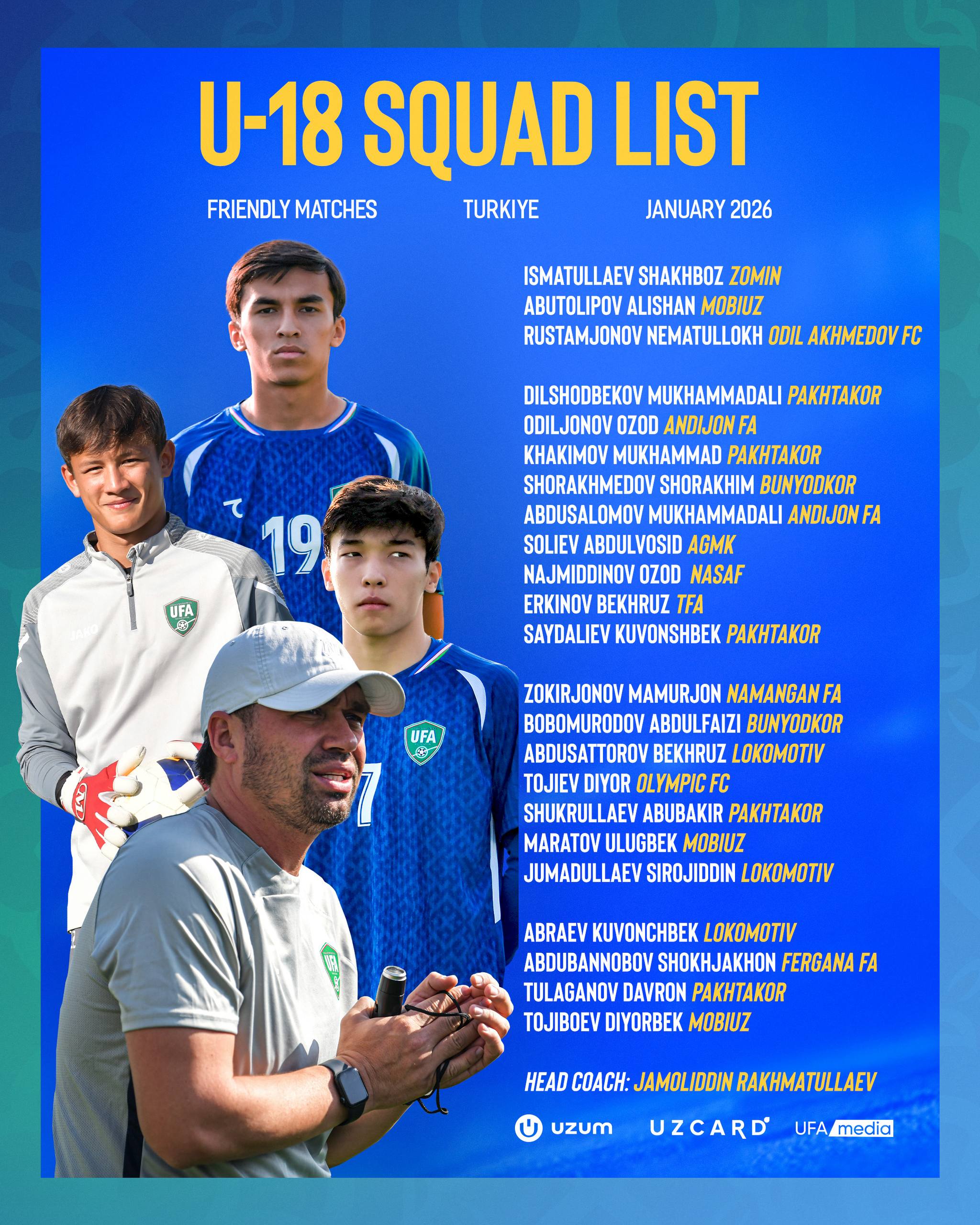 Жамолиддин Раҳматуллаев бошқарувидаги Ўзбекистон U-18 терма жамоаси 4–9 январь кунлари Миллий футбол марказида навбатдаги ўқув-машғулот йиғинларига киришади.