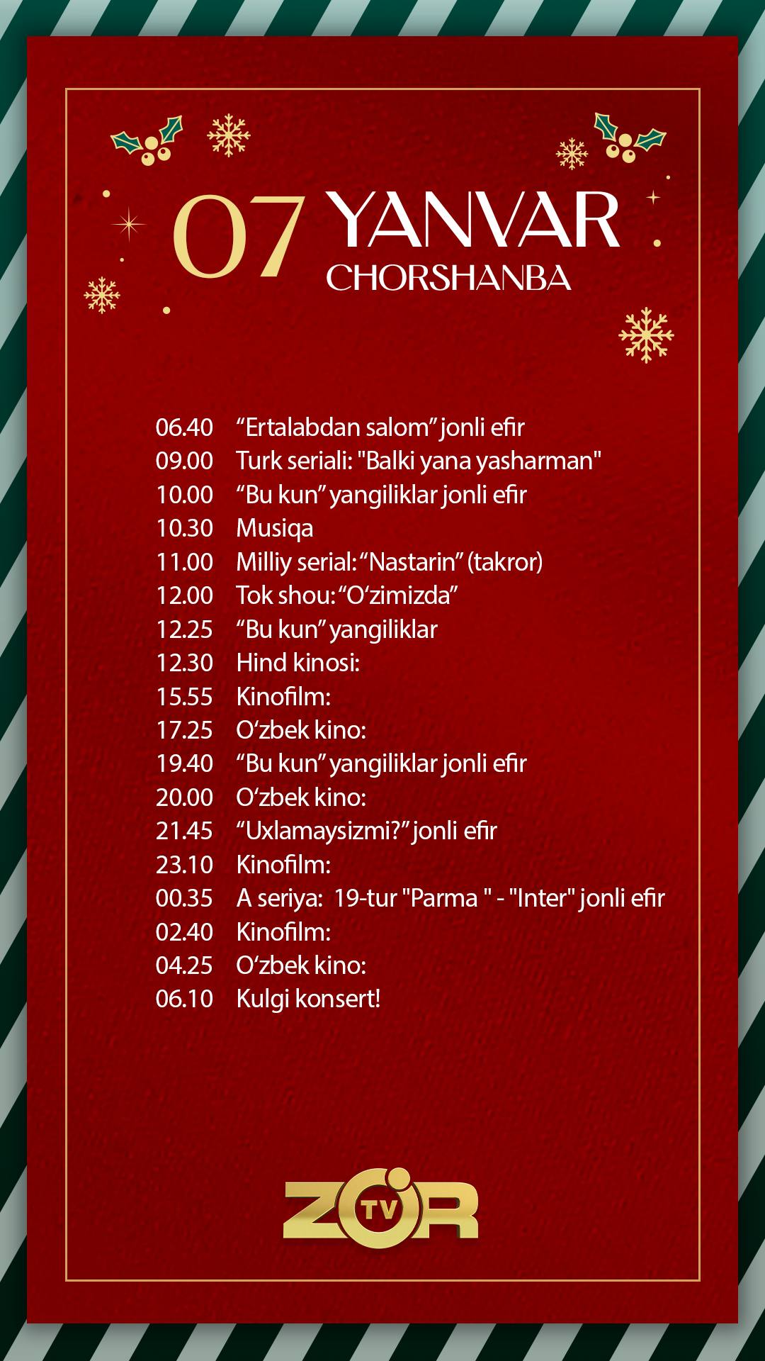 Zo'r TV телеканали бугун — 2026 йил 7-январь, чоршанба куни қуйидаги кўрсатув ва трансляцияларни эфирга узатишни режалаштирган.