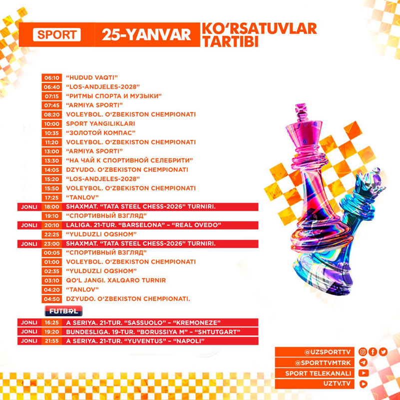 Sport ва Futbol телеканаллари бугун — 2026 йил 25-январь, якшанба куни қуйидаги кўрсатув ва трансляцияларни эфирга узатишни режалаштирган.