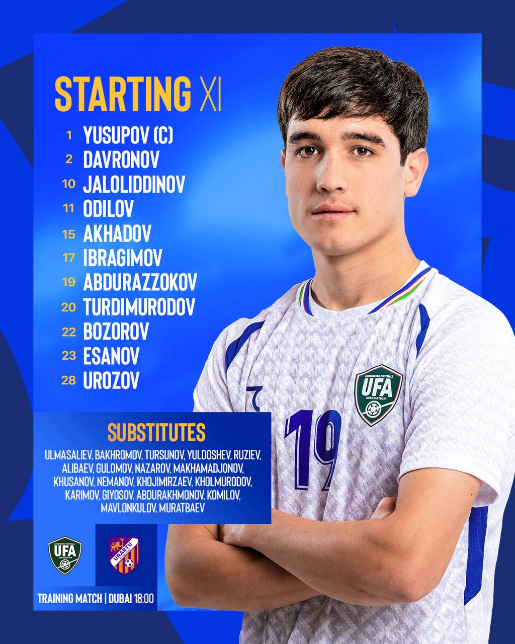 Ўзбекистон миллий жамоаси БАА йиғини доирасида бугун Арманистоннинг «Урарту» жамоасига қарши ёпиқ назорат ўйинини ўтказади.