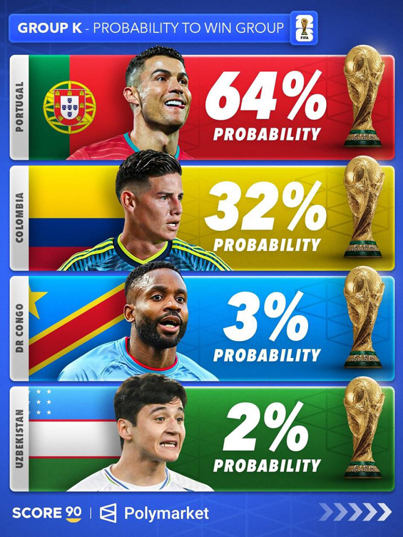 Score 90 нашри мундиал иштирокчиларининг гуруҳ босқичидаги имкониятларини баҳолади. Унга кўра, “К” гуруҳида Португалия 1-ўрин билан плей-оффга йўл олиш учун асосий фаворит сифатида кўрилмоқда. Криштину Роналду бошчилигидаги “Европа Бразилияси”нинг гуруҳдан чиқиш эҳтимоли 64 фоизга баҳоланган. Колумбия эса 32 фоизлик кўрсаткич билан иккинчи ўринда қайд этилган.