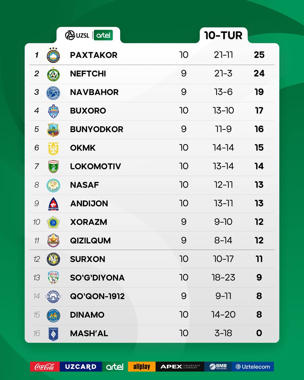Суперлигада 10-тур ўйинлари давом эттирилди.