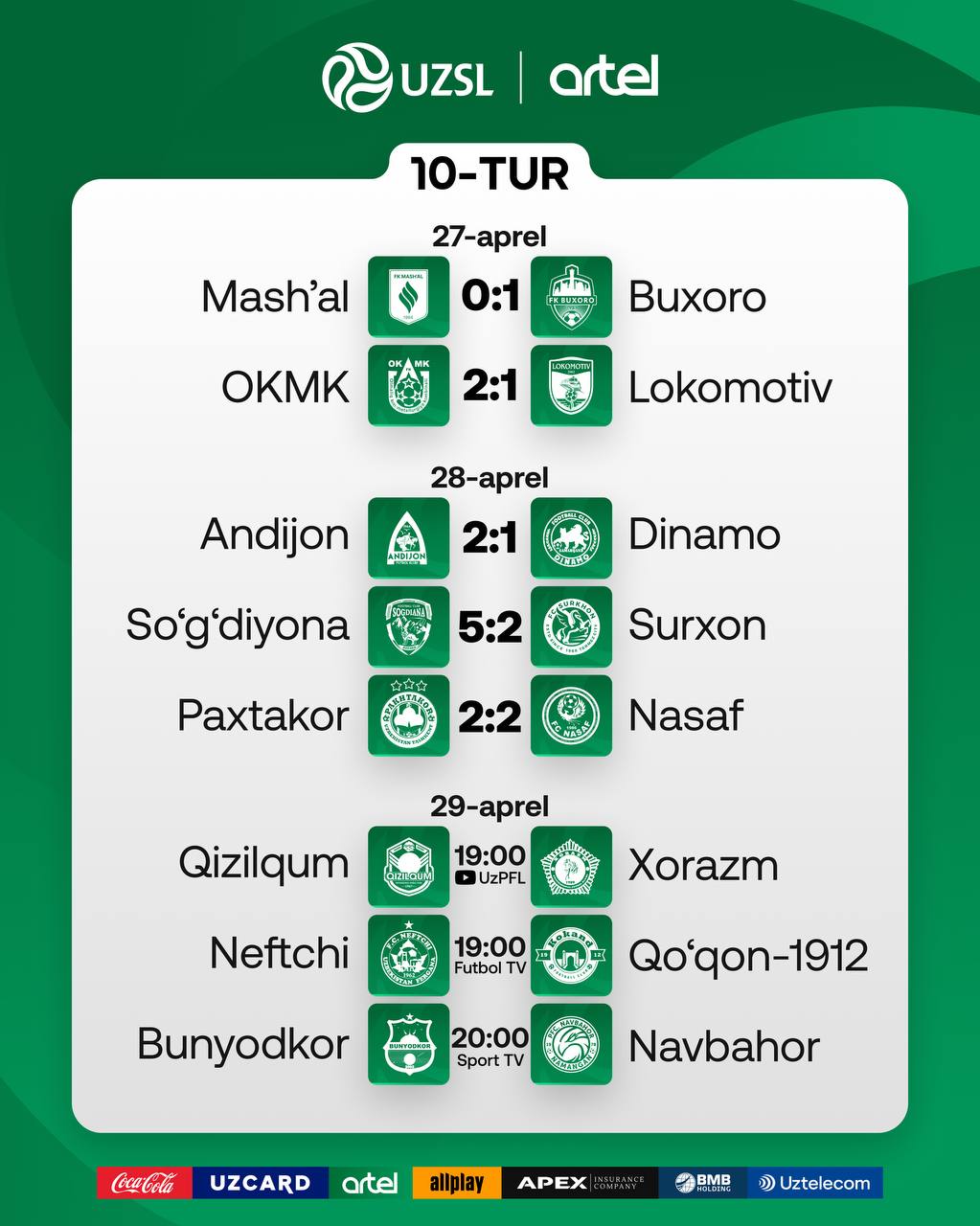 28 апрелга белгиланган ўйинларда "Андижон" "Динамо" устидан камбэк қилди - 2:1. "Сўғдиёна" "Сурхон"ни йирик ҳисобда таслим қилди - 5:2. "Пахтакор" "Насаф" билан очко бўлишди - 2:2.