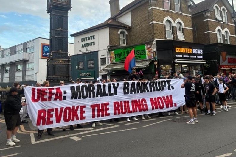 Bannerlardan birida: "UYEFA ma’naviy jihatdan bankrot. Qarorni darhol bekor qiling" deb yozilgan.