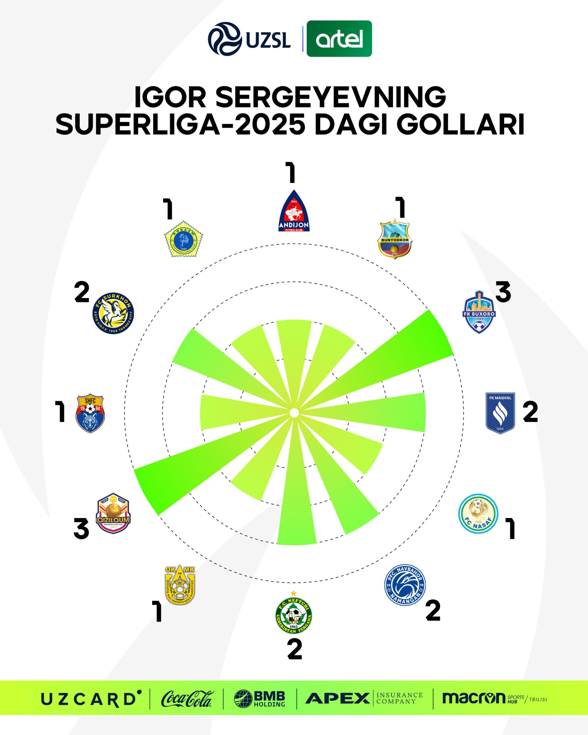 Superliganing 2025-yilgi mavsumida to‘purarga aylangan "Paxtakor" futbolchisi Igor Sergeev raqiblar darvozasiga 20 ta gol urdi.