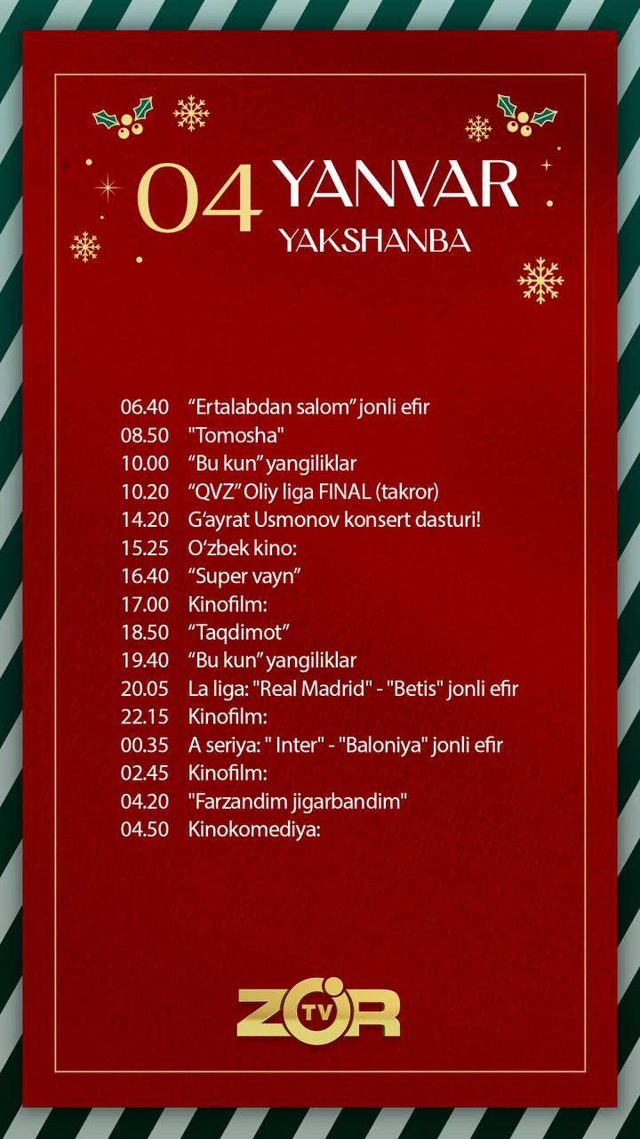 Zo'r TV telekanali bugun — 2026 yil 4-yanvar, yakshanba kuni quyidagi ko‘rsatuv va translyasiyalarni efirga uzatishni rejalashtirgan.