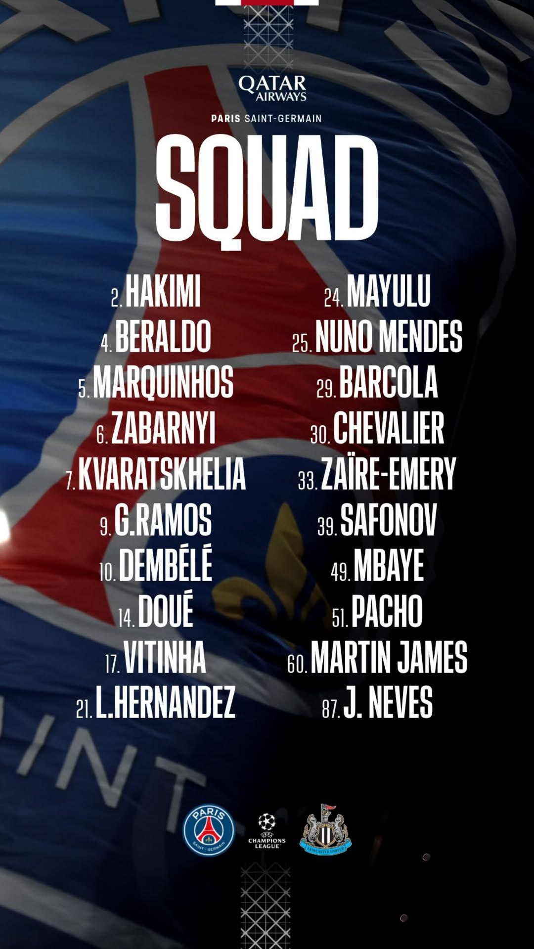 Bugun Chempionlar ligasi guruh asosiy bosqichining 8-tur o‘yinlari bo‘lib o‘tadi. Parijda "PSJ" "Nyukasl"ni qabul qiladi. Luis Enrike ushbu o‘yinda foydalanishi mumkin bo‘lgan futbolchilar ro‘yxatini ma’lum qildi.