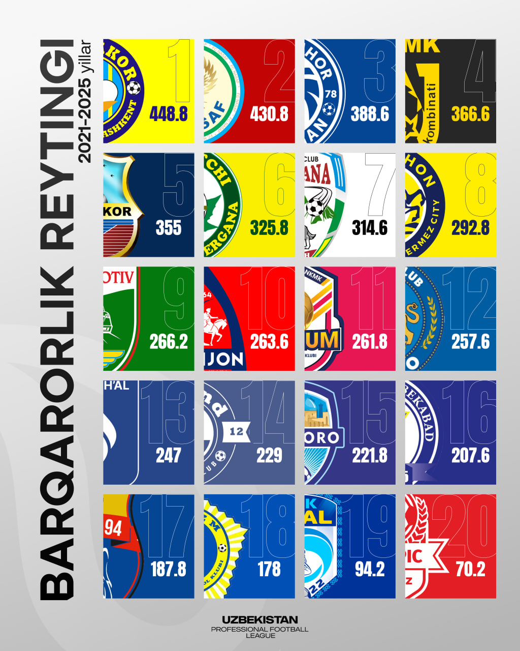 “Superliga reglamenti”ning 3.4-bandi asosida Liga barqarorlik reytingini shakllantirib bormoqda. 2027 yilgi mavsumdan e’tiboran mazkur ko‘rsatkichlar bir qator mezonlarga ta’sir ko‘rsatishi ko‘zda tutilgan.