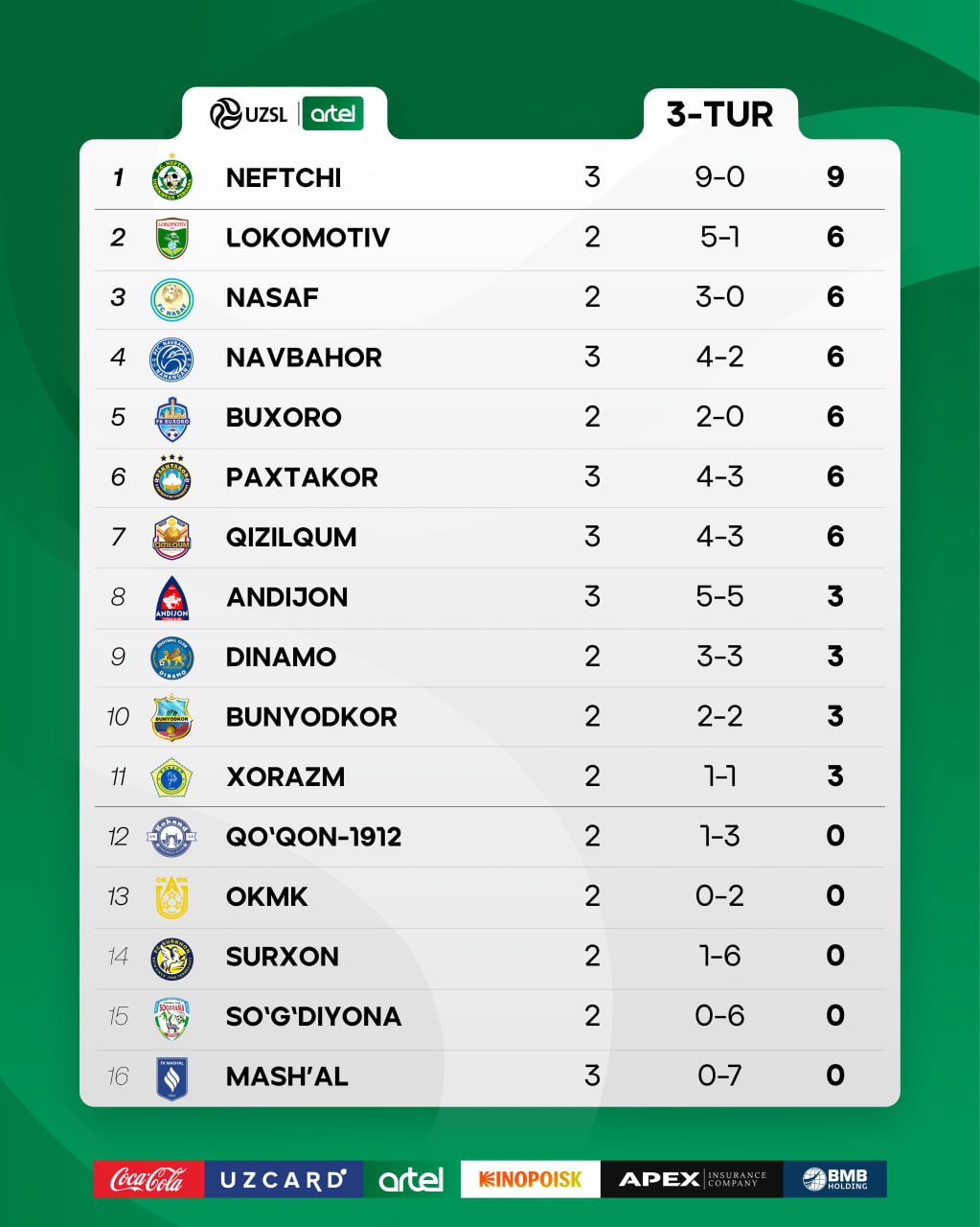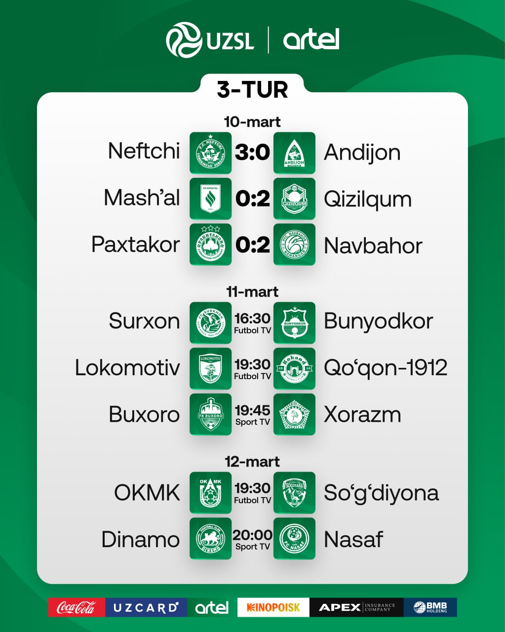 Farg‘onada "Neftchi" "Andijon"ni qiyinchiliksiz yenggan bo‘lsa, "Navbahor" Toshkentda "Paxtakor"ni yutib ketdi. "Mash’al" esa uchinchi turni ham mag‘lubiyat bilan yakunladi: muborakliklar o‘z maydonida "Qizilqum" qarshiligini yengga olmadi - 0:2