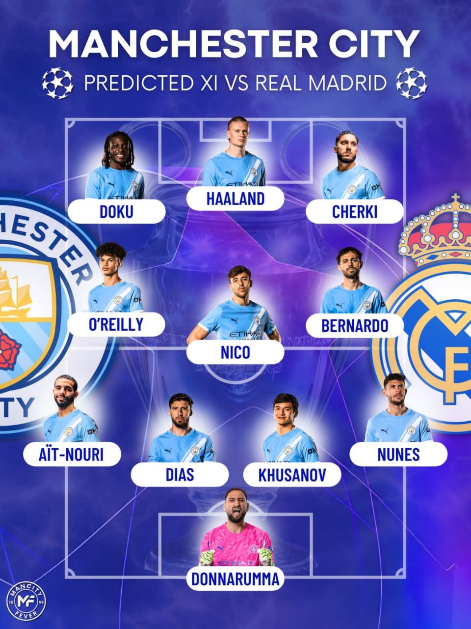 Donnarumma, Nunes, Husanov, Diash, Ait-Nuri, O'Rayli, Niko, Bernardu Silva, Doku, Sherki, Xoland.