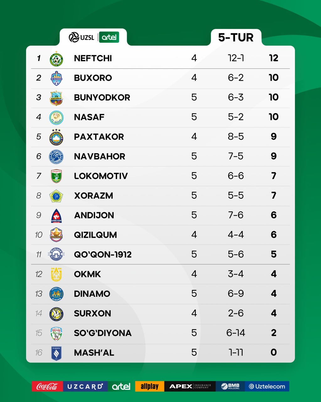 Superligada 5-tur o‘yinlari davom etmoqda.
