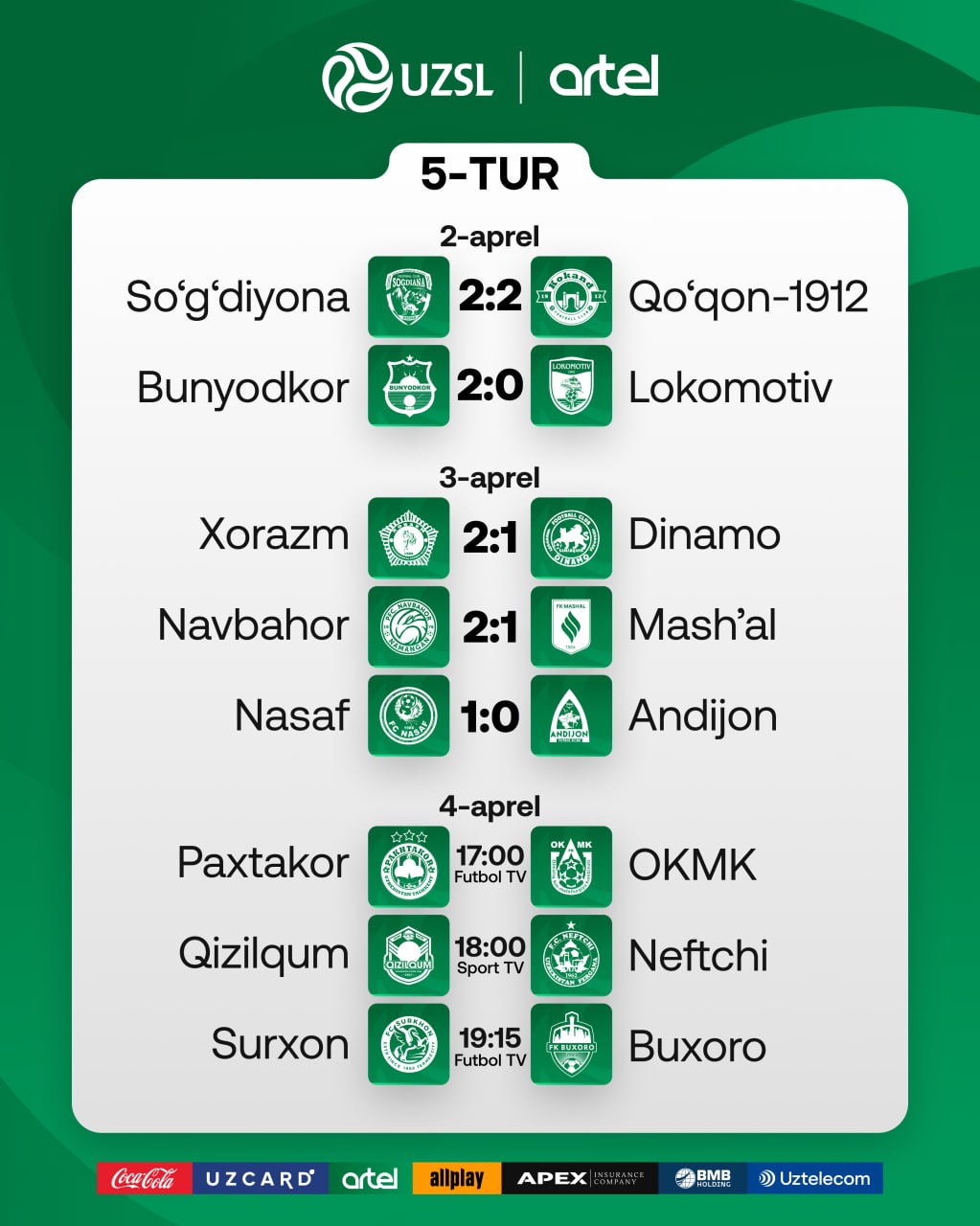 3 aprel sanasiga belgilangan o‘yinlarda qayd etilgan natijalar va turnir jadvalidagi holat bilan tanishing.