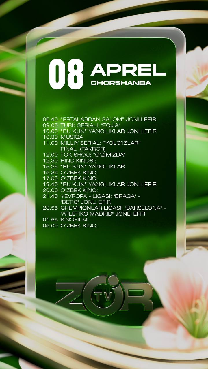 Zo'r TV telekanali bugun — 2026 yil 8-aprel, chorshanba kuni quyidagi ko‘rsatuv va translyasiyalarni efirga uzatishni rejalashtirgan.