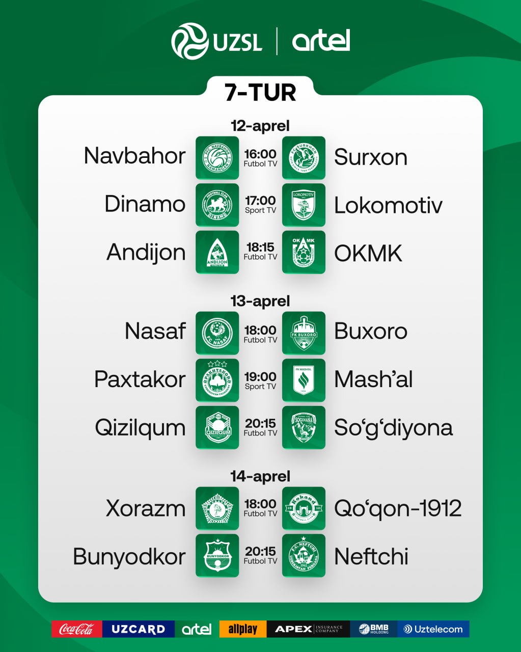 12-14 aprel kunlari Superligada 7-tur o‘yinlari o‘tkaziladi. O‘zPFL mazkur tur o‘yinlari boshlanish vaqtlarini e’lon qildi.